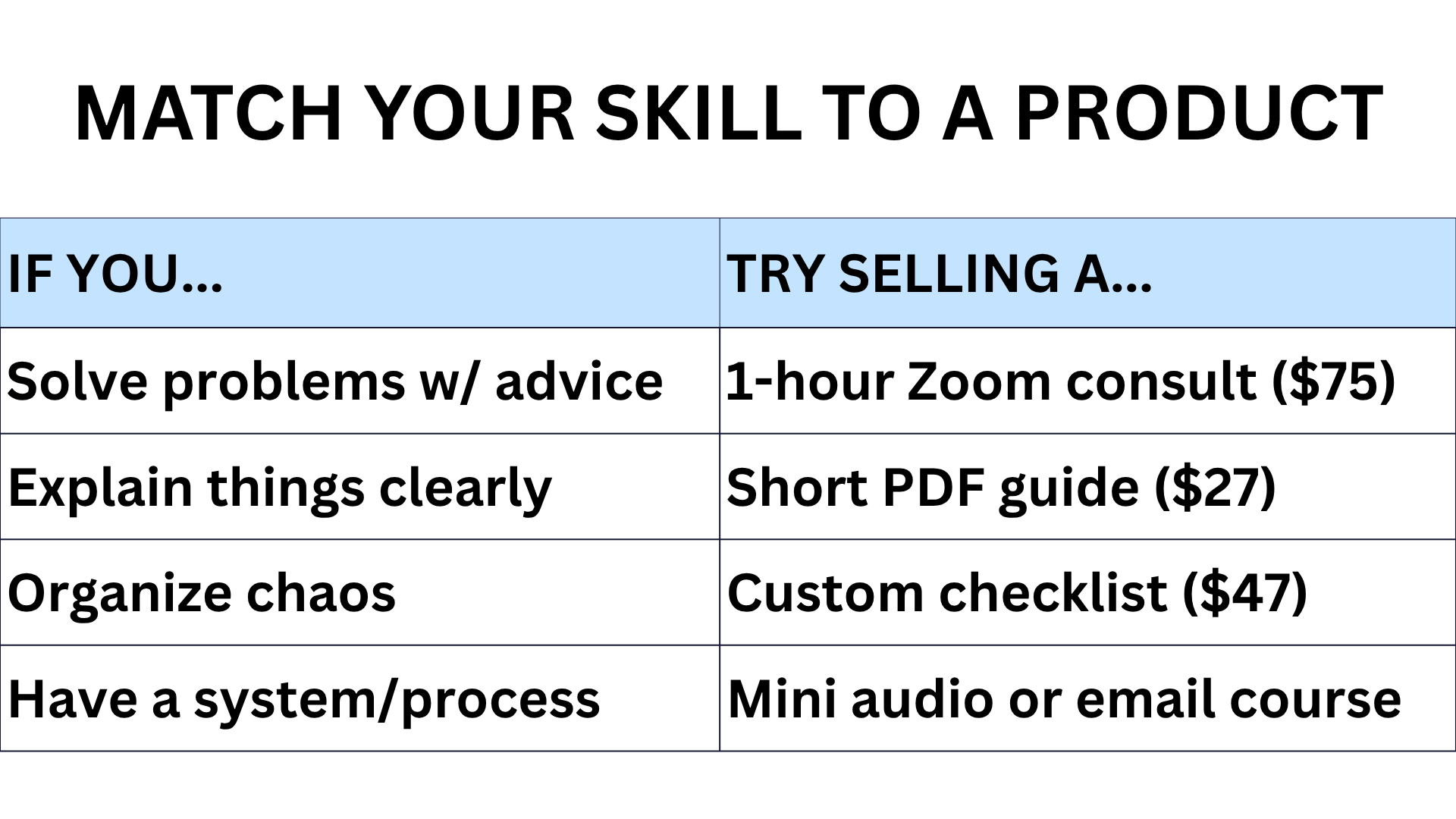 Day 2: Turn Your Expertise Into a Simple, Sellable Statement Welcome to Day 2! Now that you’ve listed a few things you’re great at, it’s time to put your wisdom into words. Today’s Step: The Cocktail Question Complete this sentence: 👉 “I help [type of person] [solve a problem] so they can [get a result].” Examples: I help overwhelmed parents reduce homework stress. I help new retirees get their money organized. I help solopreneurs simplify their week. 📝 Action: Draft 1–2 versions. Say them...